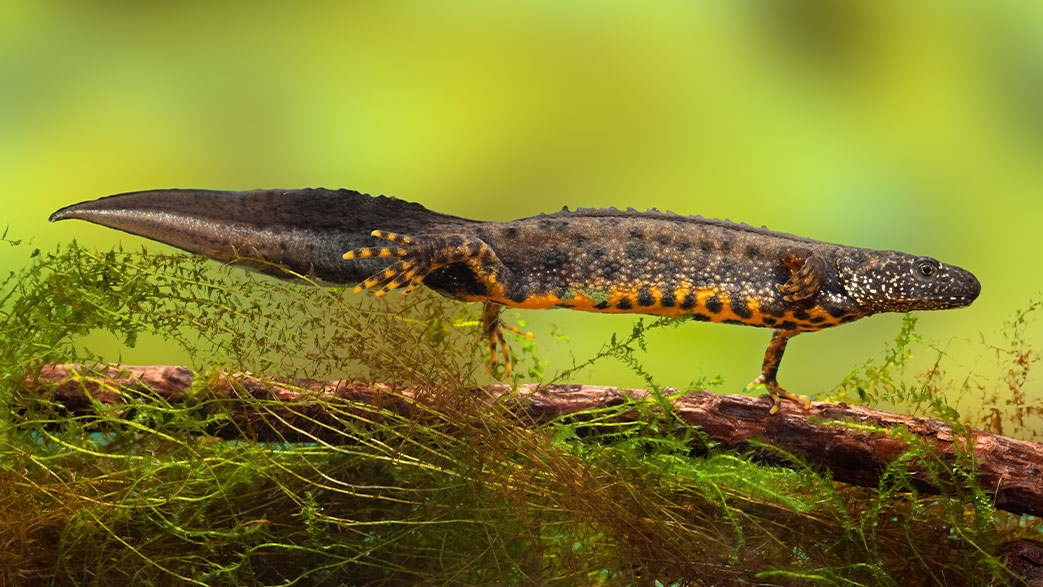 The great crested newt is the largest newt species in the UK and is known for its warty skin and distinctive orange belly with black spots.